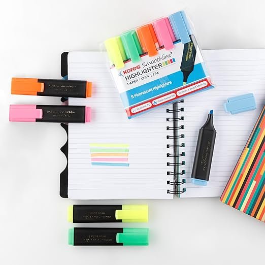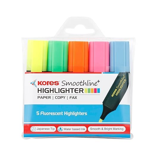 Kores Smoothline + Highlighter | Assorted Colour | Set of 5 Vibrant Colour (Yellow, Pink, Blue, Green & Orange) | Ideal Use : O